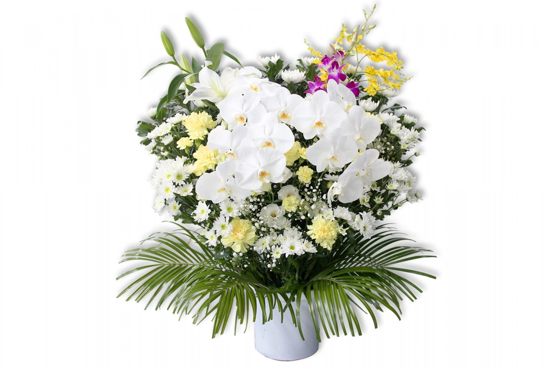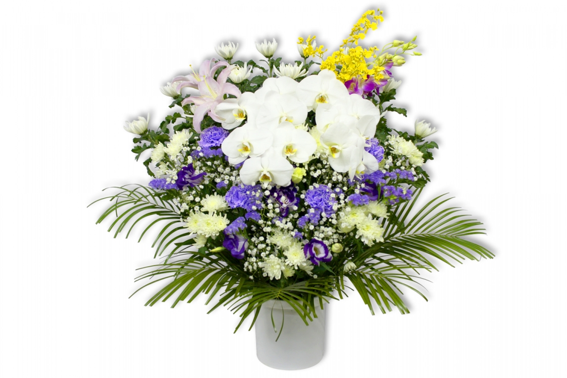 白菊と洋花を組み合わせた色鮮やかな供花です。